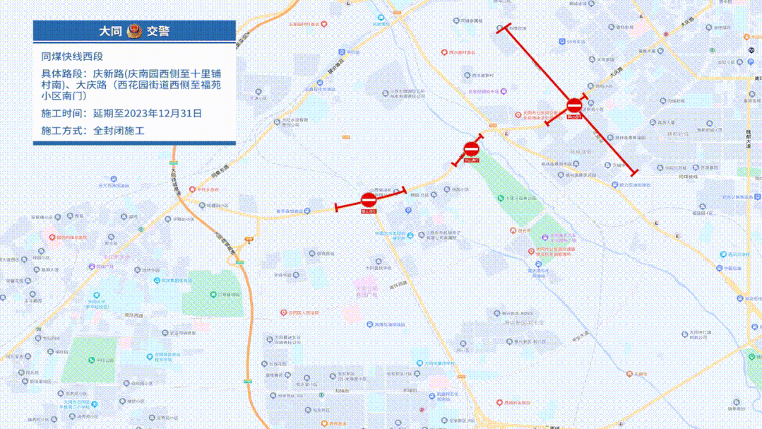 同煤快线西段庆新路(庆南园西侧至十里铺村南)、大庆路(西花园街道西侧至福苑小区南门),全封闭施工延期至2023年12月31日。