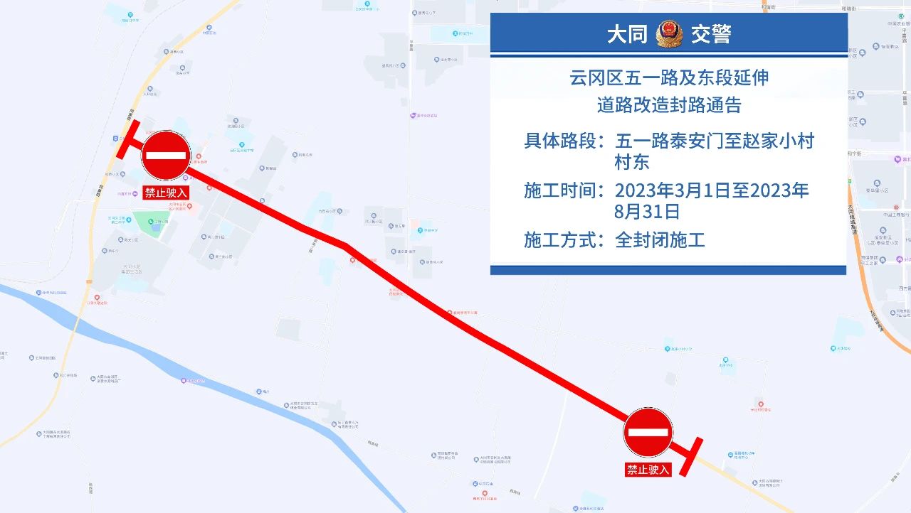 云冈区五一路及东段延伸道路(泰安门-赵家小村村东)改造工程,全封闭施工时间2023年3月1日至2023年8月31日。
