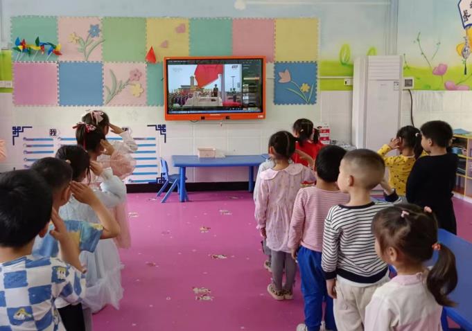 二是通过校园电子显屏滚动播放国家安全教育日宣传标语,同一时间不同空间,我园以班级为单位举行了线上“全民国家安全教育日主题升旗仪式”,随着嘹亮的国歌声,屏幕前五星红旗冉冉升起,孩子们一个个身姿挺拔,面向庄严的五星红旗行注目礼。