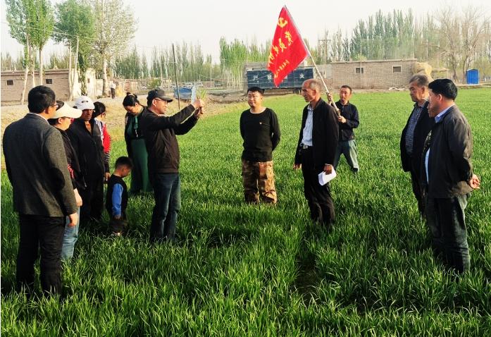 随后,一行人来到村民买买提·艾依提的小麦地开展现场指导,现场讲解冬小麦化调、除草、施肥、滴灌时间和滴水量等技术要点,并解答村民提出的相关问题和疑虑,提升村民小麦种植技术水平,有助于调整村产业结构,拓宽村民增收致富渠道。