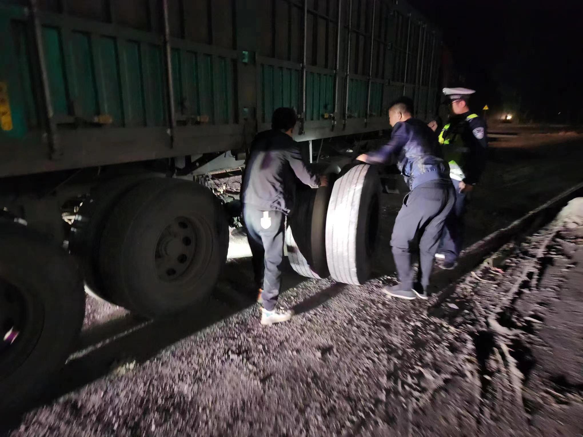 民警们立即停车询问:原来,该两人在驾驶大货车行驶中,听到车辆有异响,就仔细观察后视镜,结果发现挂车右侧的轮胎竟然不见了。于是将车辆慢慢停靠在路面,下车寻找。