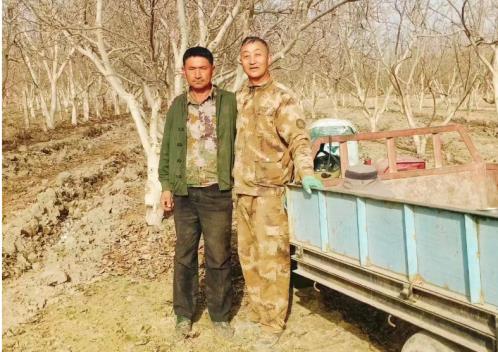 现在哈生全在村里承包了30亩核桃地,艾尔肯·台外库力把掌握的很多种植核桃的先进技术,无偿的教给哈生全。收核桃的季节人们总会看到大哥哈生全开着拖拉机,兄弟艾尔肯·台外库力忙着往拖拉机车斗里装核桃,兄弟两个一块收割核桃。兄弟俩互相帮助,核桃产量增加了,收入自然也提高了。平时两兄弟也会互借农具机械,相互帮忙,每年11月份哈生全就回老家到第二年3月份回来,期间艾尔肯·台外库力就会帮忙看房子,照看家畜,帮忙田间放水。兄弟两个共同致富,亲如兄弟、情同手足。让他们两家关系更近一步,还得从2022年疫情期间艾尔肯·台外库力帮助收割、销售核桃说起。