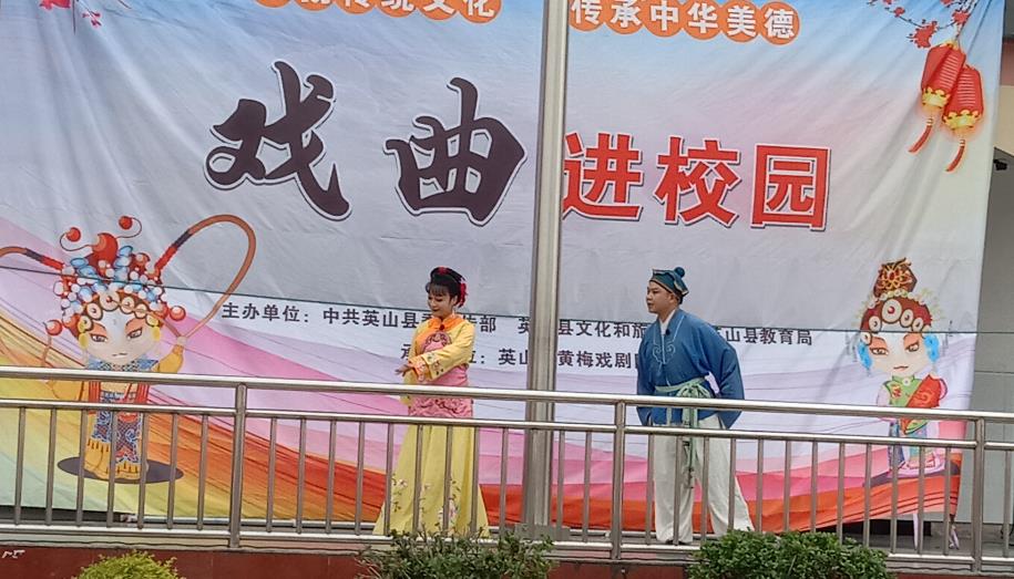 活动当天,县黄梅戏剧团的老师们为大家带来了《戏曲健身操》,黄梅小戏《夫妻观灯》等精彩表演,广大师生都报以热烈的掌声。尽管天气炎热,但同学们依然热情高涨,踊跃上台跟着专业老师学习基本动作,个个学得有模有样,欢笑声不绝于耳。同时还让师生们亲身感受到戏曲艺术的魅力,提升了广大学生的文化素养和文化自信,让传统文化在“双减”政策下遍地开花。(图文;吴颂 、曹学文)