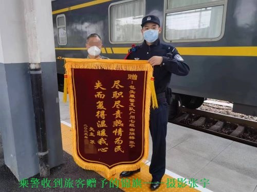 就在同一趟列车上,乘警由朕榕还帮助旅客苏先生找回了遗落在座位上的笔记本电脑,在交还电脑时意外收到了苏先生送来的锦旗。