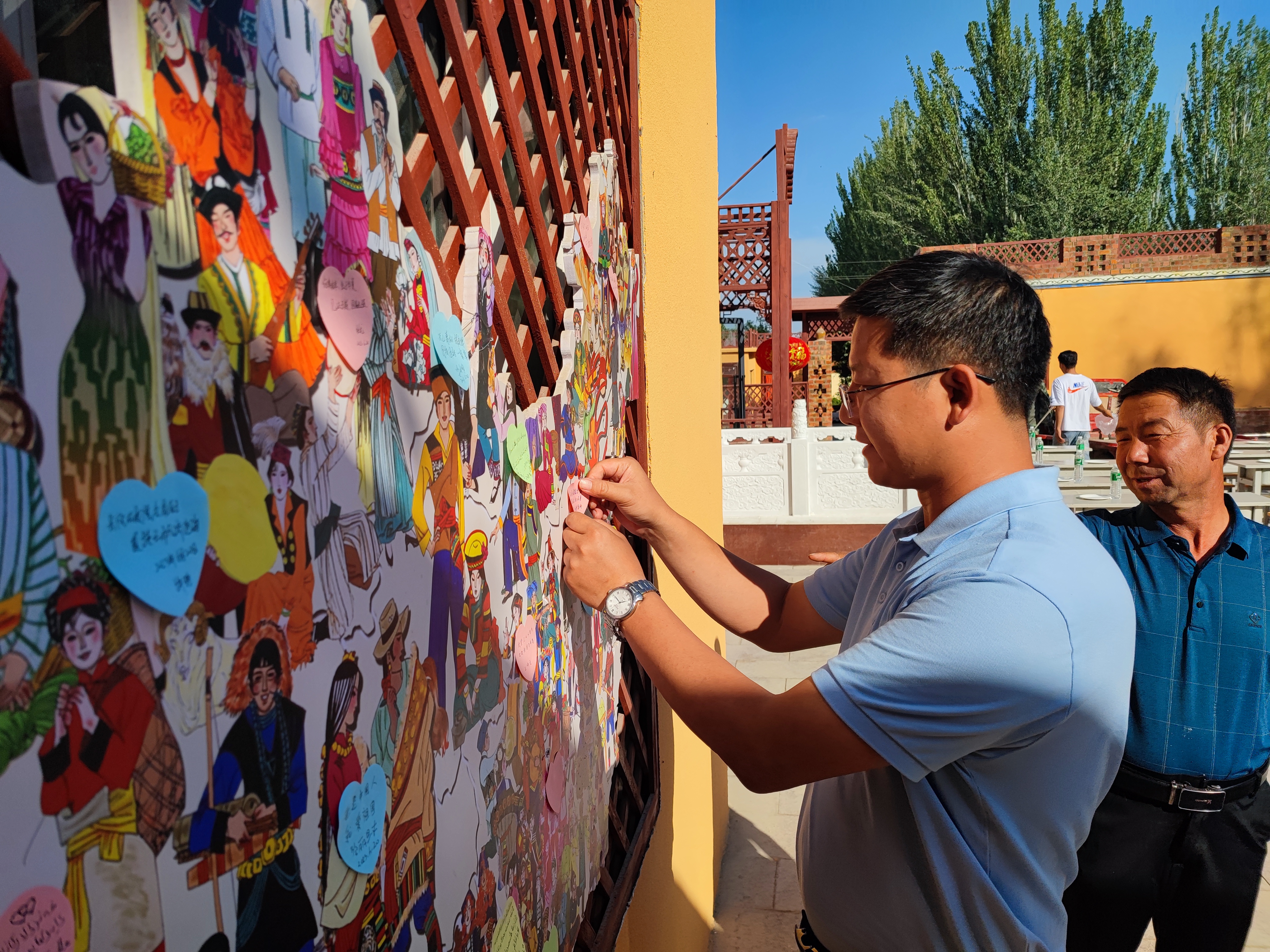 爱国主义教育基地院内瓜果飘香,葡萄架下凉风习习,维吾尔族、柯尔克孜族、汉族等各族同胞欢聚一堂,拉家常,品美食,共同迎接即将到来的中华民族传统节日端午节和维吾尔族等少数民族盛大节日古尔邦节,共话民族团结暖心事;党员干部在此开展主题党日活动,接受思想洗礼。活动开始前兰杆村党支部书记张炜向各族群众送上了节日祝福,同时带领党员干部重温了升旗老人胡达拜地·依明26年如一日在这个院子里升国旗的爱国事迹,号召党员干部继承和发扬这厚重的爱国主义精神。随后有着60年党龄的阿瓦汗·阿西木老人分享了自己的爱国爱党、民族团结的故事,讲述的兰杆村各民族栉风沐雨、团结一心、永跟党走开创美好生活的故事感染了在场的每一个人;胡达拜地的儿子库尔班也传承了父亲爱国遗志,现在兰杆村担任升旗手,上台分享了自己父亲的一些感人事迹,26年间老人用破、用旧了78面国旗,库尔班说“现在父亲不在了,我会继承他的心愿,把升国旗持续下去。”分享过程中现场掌声不断,大家听了后都深受启发和感动,在主题活动准备的心愿地图前,纷纷写下了自己对祖国繁荣昌盛和民族团结一家亲的美好祝愿。