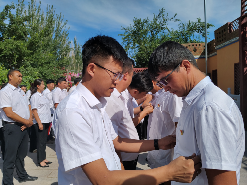 活动先在胡达拜地·依明老人生前28年如一日升国旗的国旗台上,举行了隆重的升国旗仪式。随后为新党员举行宣誓仪式,所有新老党员面对鲜红的党旗举起右拳庄严宣誓。宣誓完毕后,由老党员为新党员佩戴党员徽章,赠送《党章》,勉励他们向优秀党员看齐,时刻以合格党员标准要求自己,起到先锋模范作用。