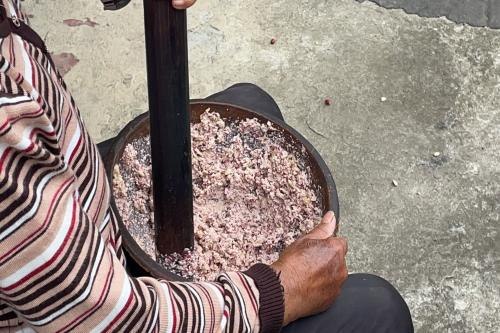 (图为村民奶奶在擂花生的图片)