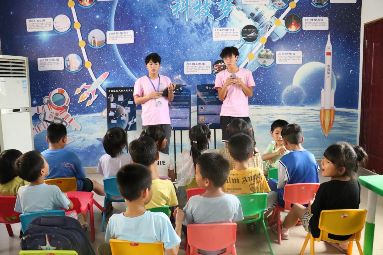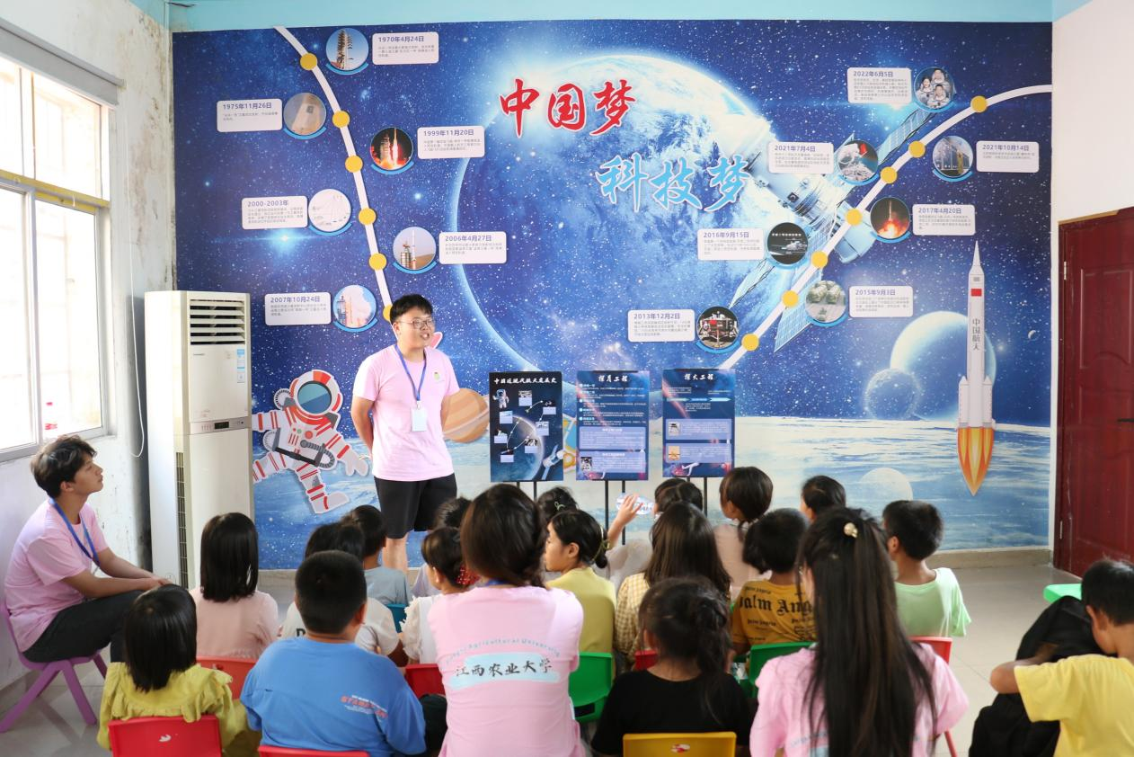 2023年7月1日,江西农业大学人文与公共管理学院围绕着“强国有我,青春有为”主题组织开展暑期三下乡活动,组建同心圆梦支教队前往江西省宜春市袁州区彬江镇社树村开展爱心支教活动,给孩子们带来了不一样的课堂体验。在7月1日的课堂中,大家为孩子们带去了一堂与众不同的科普课。大家通过梳理我国航天发展史,从魏晋南北朝的“飞天”壁画对太空的向往到拥有我国的第一个航天站,回顾千年对太空的探索,为他们讲述爱国志士、功勋人物的感人故事,同学们的眼神从好奇到坚毅,小小的改变却已埋下浓浓的爱国情怀;在科普课上,大家将中国人对太空的向往透过图片、文字鲜活的展现在学生的眼前。历史不再成为历史,学生们与过去的时代交流,感叹国家的伟大和中华民族的坚韧,更让他们心里留下”强国必有我“的责任担当。