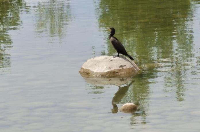 7月9日,在第一师四团永宁镇永宁路景观河面,一只水鸟悠闲站在一块石头上,这安静恬淡的场景勾勒出一幅人与自然和谐相处的画卷。