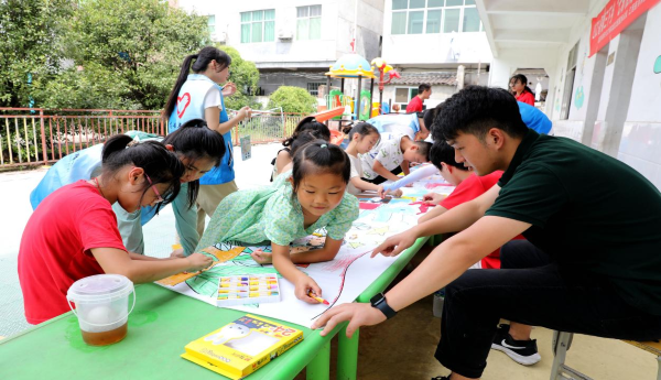 (图为志愿者与小朋友们一同绘画)