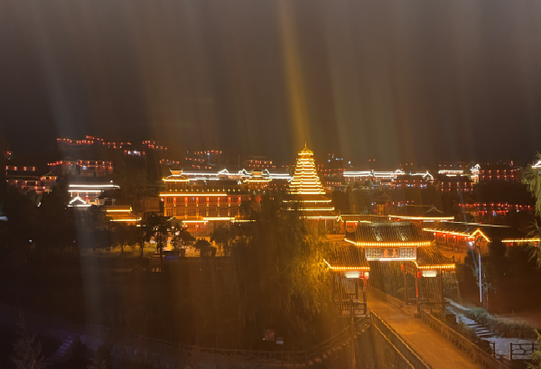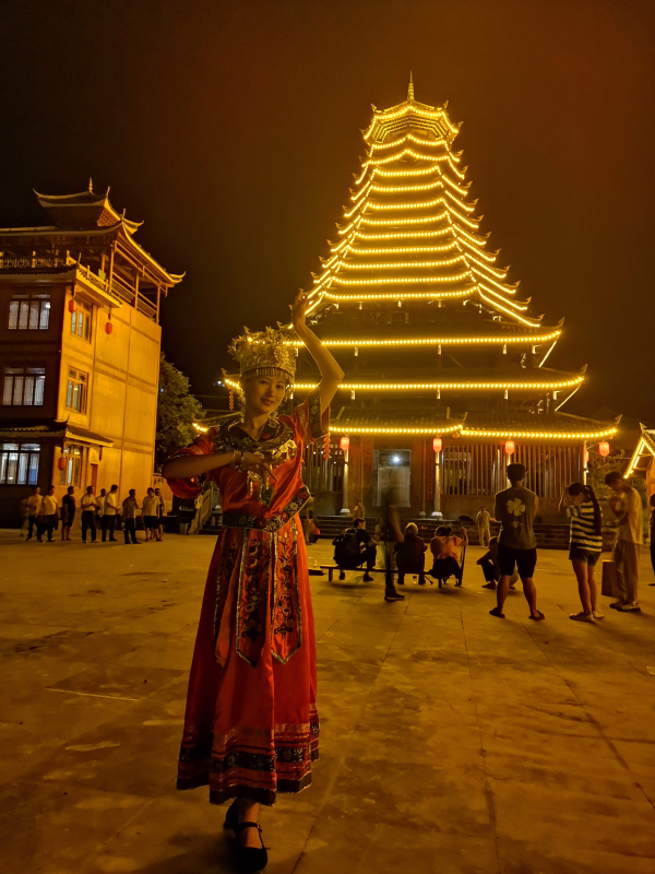 7月20日晚,一位身穿侗服的侗族姑娘在大寨文化广场上翩翩起舞,秀美的舞姿映衬着夜间的灯光显得格外的亮眼。站在文化广场中央,眼前的一切仿佛是一场视觉盛宴,四周的鼓楼、迎宾馆、牌坊流光溢彩,远处层层叠叠的民居中,火红的灯笼点缀其中,靓丽的灯笼随风摇曳,给宁静的夜色增添了一丝别样的烟火味。
