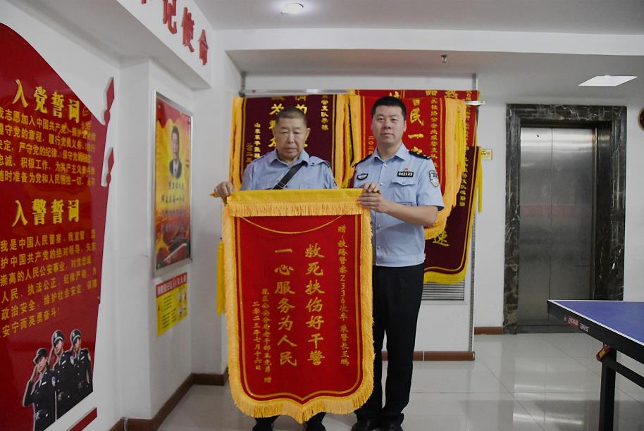 7月17日,一位七旬老人来到呼和浩特铁路公安局包头公安处乘警支队,拿出一面印有“救死扶伤好干警,一心服务为人民”的锦旗, “好同志,真是太感谢你了!”老人一边说着,一边将锦旗递到了乘警王鹏的手中。