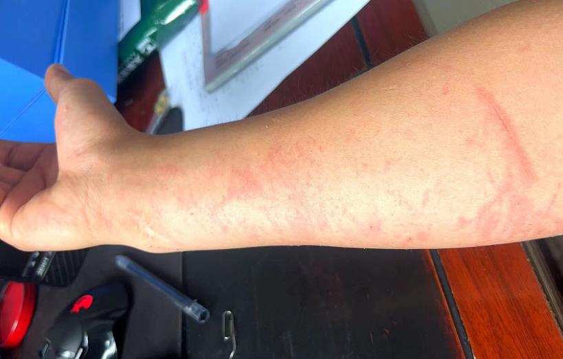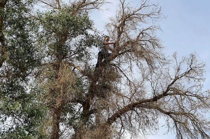 经了解,一行四人是北京来疆旅游的游客,因想拍下浩瀚无垠的夏日胡杨,便在胡杨林中试飞了无人机,但因不熟悉所处的环境,导致操作失误,将无人机卡在了一颗胡杨树稍上。民警到达现场后,发现卡住无人机的胡杨树将近20米高,只能从就近居民家借了梯子,配合皮卡车,由一名警员佩戴防护绳索后爬到树顶才将无人机取了下来。看到民警被树枝刮伤的胳膊,游客们感动不已,连连道谢后表示以后还会再来美丽沙雅游玩。(通讯员:窦明媛、王军涛)