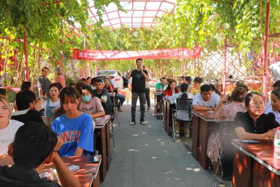 8月4日,在新疆库车市牙哈镇博斯坦托格拉克村的葡萄架下,来自该镇20多个村的100余位村民,通过打语言牌、汉字组词比赛的形式相互交流,了解汉字由来,以牌为媒、交流为介,村民们在玩乐中感受汉文化之美,一时间葡萄架下人声鼎沸,欢乐无限。