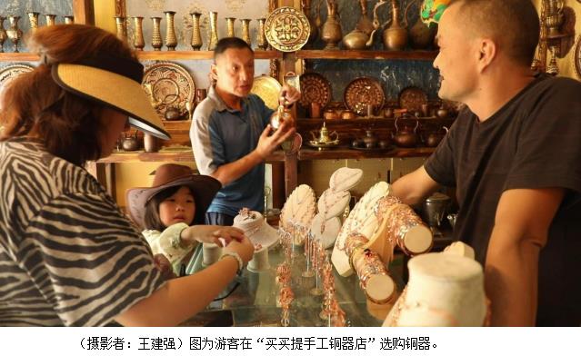 正值旅游旺季,来“买买提手工铜器店”的游客络绎不绝,玉素甫·卡地介绍说,以前生意不好做,这几年,随着旅游产业的复苏和国家对非物质文化遗产保护传承的重视,越来越多的家庭喜欢用铜壶、铜盘、铜碗等家庭用品了,人生意越来越好做,每天都能买出十几件作品。