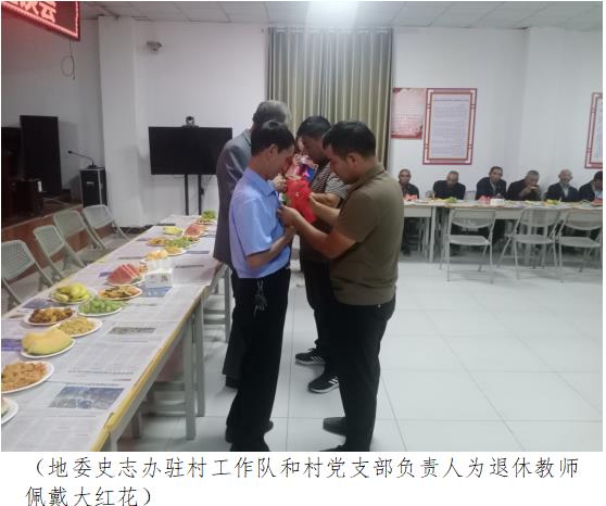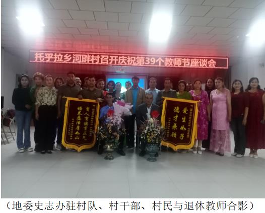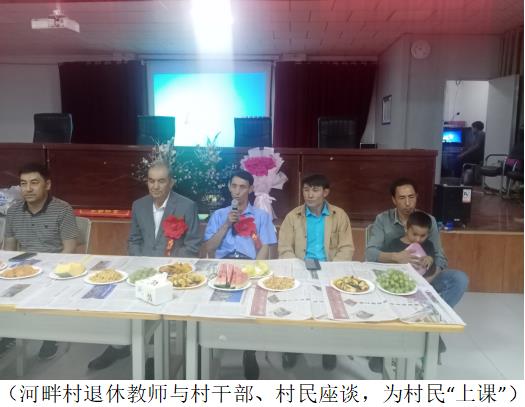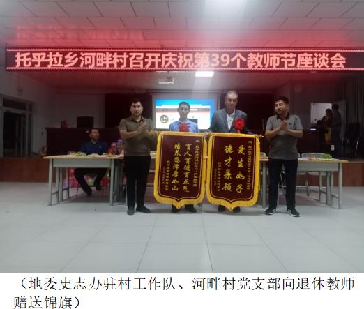 河畔村党支部书记穆萨江·玉山致辞,代表工作队、村党支部向本村两名退休教师表示节日的祝福和诚挚的谢意。和着歌曲《老师》的音乐声,艾山·萨依提和毛尼亚孜·吐尼亚孜两位退休教师面带笑容,神采奕奕、精神矍铄地来到主席台前,工作队和村党支部负责人为两位老师佩戴了大红花,敬献了鲜花,并将写有“育人育德育正气 培养恩泽厚如山”和“爱生如子 德才兼顾”的两面锦旗分别送到两位老师手中。全场响起热烈掌声。