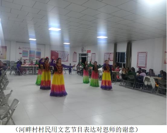 桃李不言,下自成蹊。艾山·萨依提和毛尼亚孜·吐尼牙孜两位老教师从教近40年,河畔村大部分村干部和村民都曾经是他们的学生。难忘恩师培育恩。大家主动上前与两位老师合影,送祝福,真心祝愿两位老师身体身体健康,幸福快乐。村民表演了充满尊师重教气息的文艺节目,用歌声、舞蹈、小品表达对恩师的谢意。