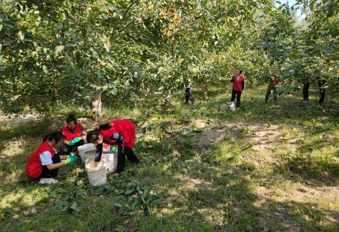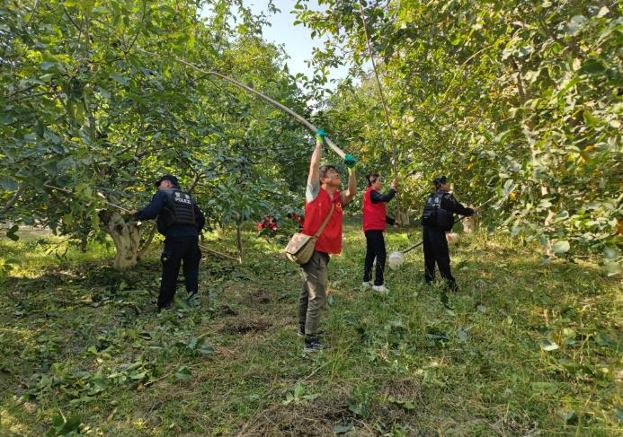 在河崖村四小组的一处核桃种植地里,一排排核桃树长势正旺,核桃挂满枝头,辖区工作队、村干部、村警以及党员们组成的石榴籽志愿者服务队在地里来回穿梭,和果农们一起采收核桃,助力丰收。