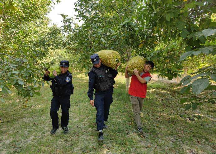村民艾孜买提·艾沙开心的说道:“非常感谢工作队、村干部和村警的帮助,感谢党和国家亲切的关怀,让我家的18亩核桃能够快速采摘完成,让我有个好收成!”