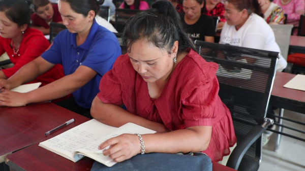 在库车市玉奇吾斯塘乡吐格其村科技文化中心,村民们在新疆师范大学驻玉奇吾斯塘乡吐格其村工作队实习老师的带领下,认真学习普通话中的日常用语,并通过朗读、问答、对话等互动方式,进一步激发大家的学习兴趣,铸牢中华民族共同体意识。