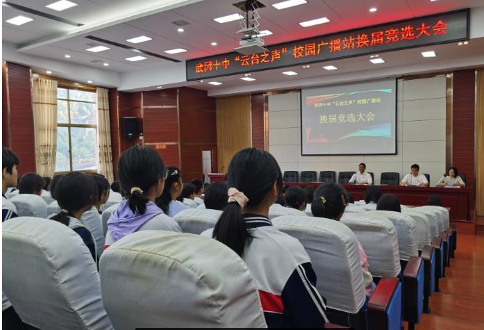 为活跃校园文化生活,更好抒发学子心声,10月17日下午,武冈十中在博闻楼学术报告厅隆重召开2023年下学期广播站换届竞选大会。学校党政办主任周定伟、团委书记肖本武、广播站全体成员和相关工作人员到场参加会议并分头负责竞选工作。办公室干事、广播站负责人段媛主持大会。