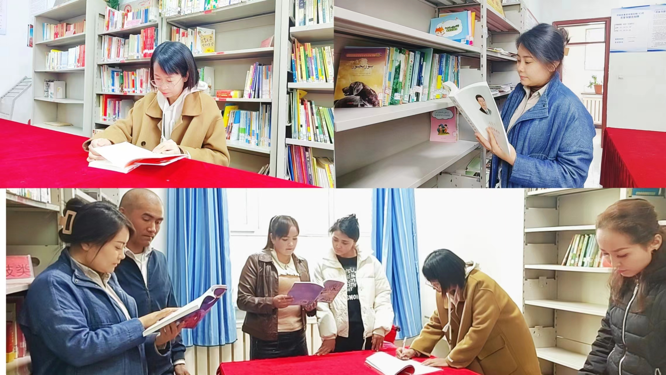 活动开始前,拉帕村图书室专职管理员沙尼亚木·库尔班和工作队员蒋海云、阿斯叶买买提明早早就来到书屋,整理好所需图书,准备好图书借阅登记本,等待着村民前来“充电”。
