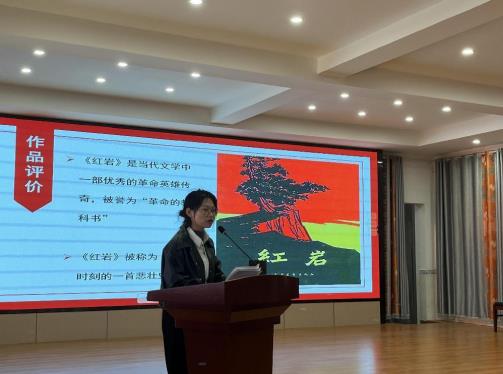 第三位分享的老师是段红梅老师。段老师通过阅读名著《红岩》,分享了自己的真切感受。《红岩》说是一部以历史叙事为目标的“小说”,不如说更是一部关于人的信仰的启示录。这部小说是严格按照当时意识形态规范和已有的文学写作规范的要求与观念创作而成的。它是从“身体”入手,阐释在红色狂欢的受难姿态中“身体”的痛感如何成为一种信仰道义充斥的革命浪漫激情所替代。书中一个个鲜活的形象“江姐”“许云峰”“小萝卜头”,他们身上那种坚贞不屈,英勇无畏的精神,感动了我们无数人。