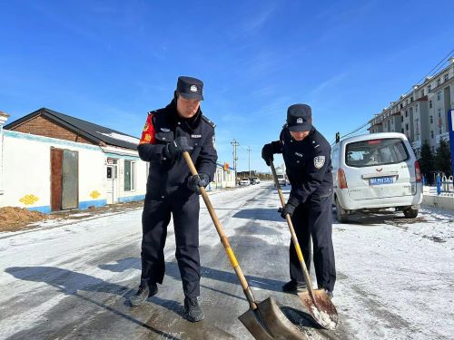 雪后道路结冰给旅客出行带来不便,尤其是桑根达来站区附近道路积雪较厚。为保障旅客出行安全,桑根达来车站派出所组织青年民警成立先锋队,紧急出动,清扫道路积雪,铲除道路结冰,以最快的速度清理出一条可供行人和车辆安全出行的道路,他们忙碌的身影是对旅客出行安全最大的保证。
