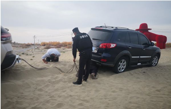 据悉,当日15时许,沙雅县盖孜库木派出所接到群众报警称:在塔里木湿地旅游景区(世原始胡杨林生态文化景区)内,有一游客的车辆陷入沙地出不来了,需要帮助。接到求助后,盖孜库木派出所立刻通知附近巡逻警力携带救援工具赶往现场救援。