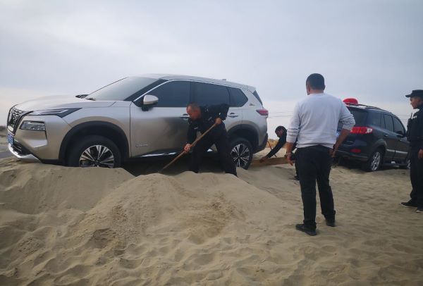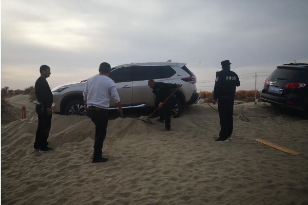 到达现场后,民警发现游客的车深陷在胡杨林内的松软沙地里。“先将车底沙子挖空,再将车辆拉出来。”救援民警们经验丰富,检查现场及车辆情况后立刻确定了救援方案,众人经历了近一小时的车拽人推,终于拖出被困车辆。(通讯员:王军涛、陈曦)
