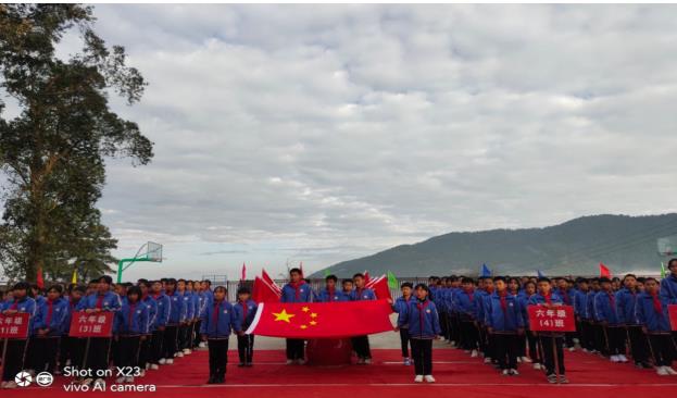 扬雄风,挺傲骨,步履铿锵;升国旗,奏国歌,红旗飘扬!迎着晨光,运动场上全体人员肃立,齐唱国歌。鲜艳的五星红旗徐徐升起,国旗与晨光交相辉映,腰街中心学校全体学生向光而行,尽展风采。