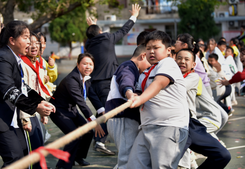 图为:2023年12月6日,学生在贵州省黔东南苗族侗族自治州从江县城关第一小学参加冬季运动会拔河比赛。