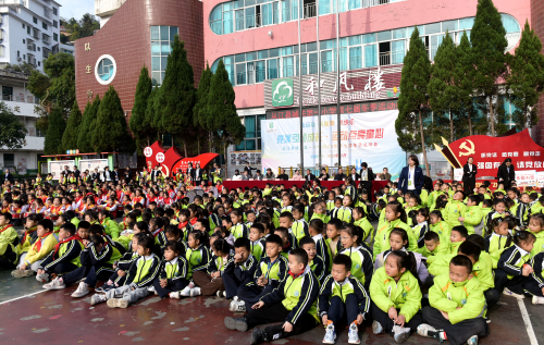 2023年12月6日,学生在贵州省黔东南苗族侗族自治州从江县城关第一小学参加冬季运动会开幕式活动。