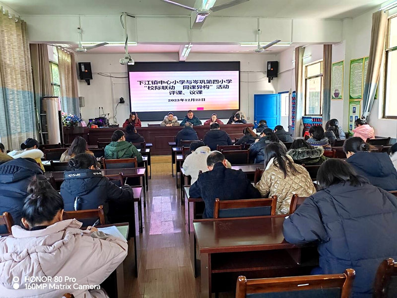 为促进教师专业水平发展,提高教师的教育教学技能,搭建教师相互学习、相互交流、相互借鉴、共同提高的平台,达到优势互补,相互促进,教学相长的目的。2023年12月22日,岑巩县第四小学一行10人到下江镇中心小学开展“校际联动 同课异构”教研活动。活动期间,学校领导、各教研组长以及全镇村级完小的教务主任全员参与。此次活动包含语文、数学、英语教师同课异构课堂展示、议课、评课、活动总结四个环节。
