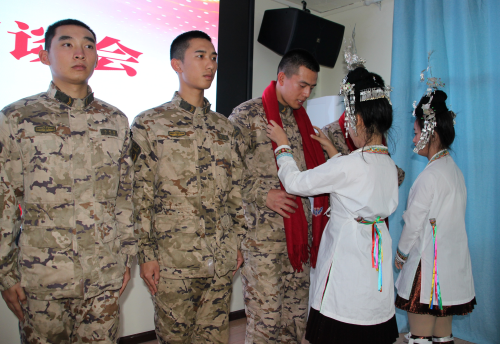 图为 “春蕾女童”为武警官兵赠送手工伴手礼现场(石峰林 摄影)