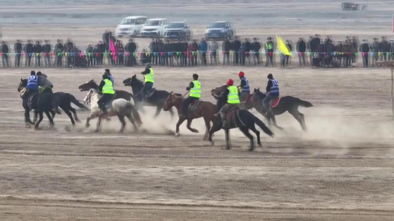 冬日的赛马场上人头攒动,来自库车市各乡(镇)的15组参赛骏马和优秀骑手齐聚场地,跃跃欲试。随着赛马哨声令下,一匹匹骏马在骑手们的驾驭下冲向赛道,你追我赶、直奔终点,赛场上尘土飞扬,欢呼声、呐喊声此起彼伏,整个赛场都充斥着马背上的“速度与激情”。