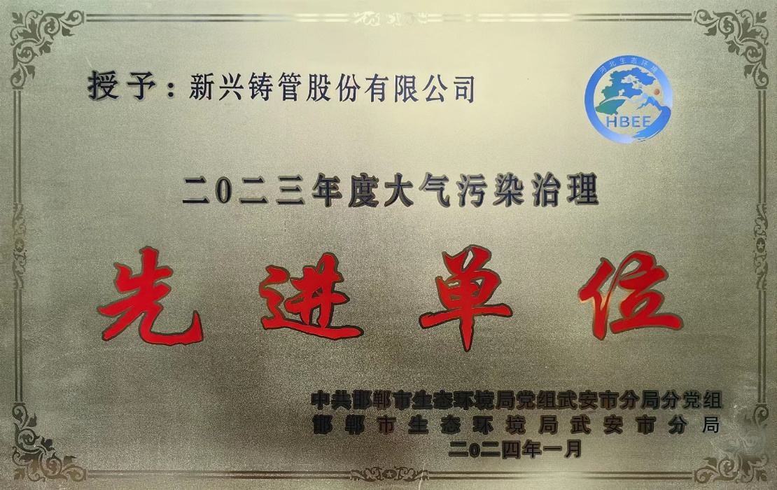 近日,邯郸市生态环境局武安市分局为表彰2023年度新兴铸管股份有限公司武安本级在大气污染治理方面作出的突出贡献,特授予新兴铸管股份有限公司2023年度“大气污染治理先进单位”的荣誉称号。