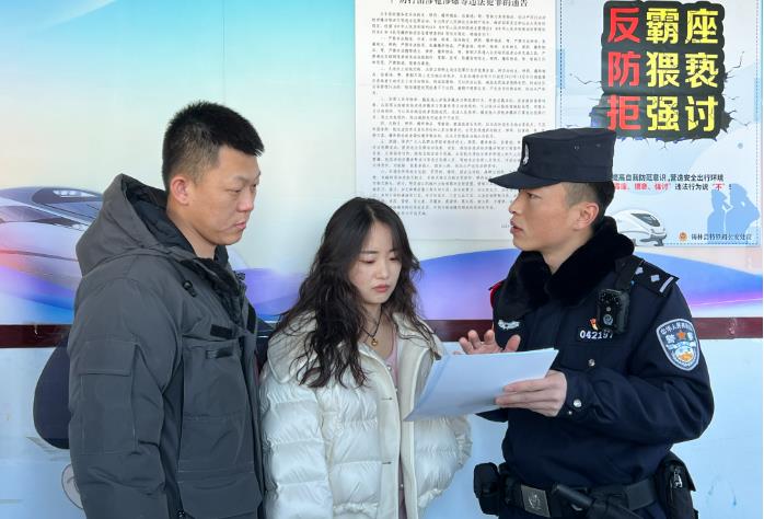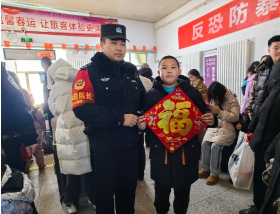 期间,化德车站派出所青年民警深入化德站扶老携幼,帮助困难旅客提拿行李。同时,民警在候车室开展了形式丰富的宣传活动,利用现场宣讲、发放传单、有奖竞答等方式,深入讲解了电信诈骗的常见手段和安检常识,为旅客解答了出行中遇到的疑难问题,并向旅客发放了“福”字、龙年对联、手提袋等小礼品,切实提升了广大旅客幸福感、获得感、安全感,温暖了旅客返乡之路。(化德车站派出所:陈娜)
