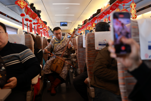 包头开往北京北的G2494次列车充满了浓浓的节日氛围,伴随着民警悠扬的马头琴声,以“欢乐过元宵 平安我守护”为主题的警民元宵活动拉开帷幕。