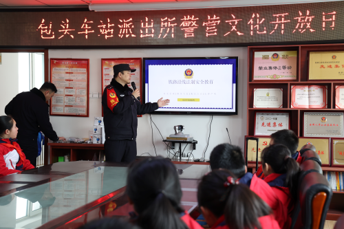 近日,为做好校园及周边铁路安全工作,进一步提升未成年人的安全防范意识,包头铁路警方开展警营文化开放日活动,邀请包头师范学院实验小学的同学们来到包头车站派出所参观学习,近距离体验警营文化。