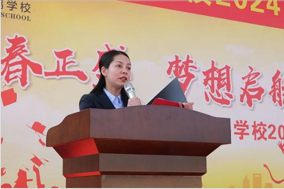 青春立志逐梦想 ,少年有为勇拼搏。天鹅学校校长赖军同志的致辞饱含深情、催人奋进。他首先鼓励学生用最热烈的掌声谢亲恩,谢师恩。然后简要回顾办学三年来取得的成绩,感谢全体师生的的齐心协力,让天鹅学校形成了教风优良、学风浓厚、校风清净的良好局面。他要求学生严以自律,见贤思齐,挑战自我,做最好的自己。期望同学们把青春的豪迈和铮铮的誓言化作务实的行动去冲刺、去迎战、去书写天鹅学校首届中考的新篇章!报答老师的辛劳,我们唯有泛舟学海方能鹰击长空;不负父母的厚望,我们唯有自强不息方能未来可期;厚植爱国的情怀,我们唯有硬核实力方能立足世界。