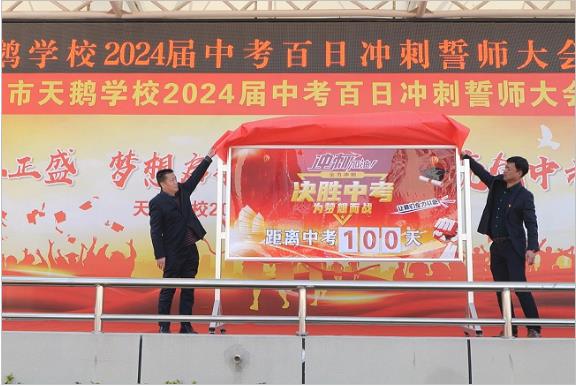 时间公正迎考验, 争分夺秒赛学习。天鹅学校副校长田立勋、王英朋为“中考倒计时100天”揭牌。中考倒计时牌上不仅仅是一个数字,更是中考决战冲锋的考验。与时间赛跑,比学习效率才是赢者的法宝。从此刻起,天鹅学子们美好的理想和期待将通过分分秒秒的挑战来实现。