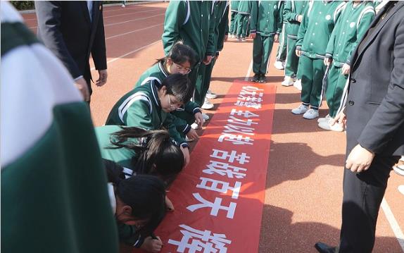 书写誓言立壮志 ,坚定行动搏百日。活动尾声,老师和学生们郑重地在横幅上签上自己的名字。这是百日誓师大会上庄重而又自信飞扬的宣告,又是奋战一百天的坚定誓言。部分班级还在“梦想门”前拍下班级合影,绽放的笑容,快乐的呐喊又是一道道亮丽的风景。