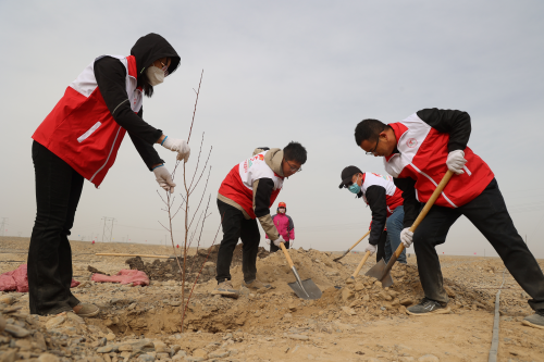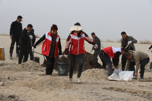 在植树现场,干部职工精神饱满、干劲十足,大家分工合作、配合默契,一派热火朝天的繁忙景象,一株株新栽的树苗迎风挺立,生机勃勃。