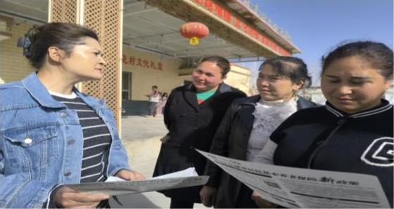 图为:4月11日,温宿县社保中心工作人员在托乎拉乡组织开展“社保政策送上门”宣讲活动(江凯摄)
