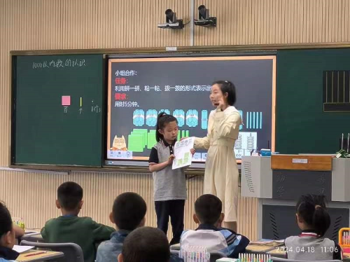授课环节,实验小学熊雅婷老师和一师三中教师黄俊佳进行同课异构,讲授二年级数学《1000以内数的认识》。熊雅婷老师以“数”这个字,渗透数学文化,引入新课。在授课过程中,熊老师注重引用史料来丰富教学内容和提升学生的数学素养。黄俊佳老师学生喜爱的电影为导入抓住学生的眼球,使复杂的数学知识变得生动有趣、易学易懂。在课堂上不仅使用传统的讲授法来传授知识,还结合了讨论法,鼓励学生提问和参与,使得学习过程更加生动透彻。