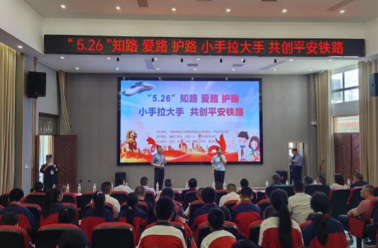 为进一步提高师生爱路护路意识,增强爱路护路的自觉性,确保师生出行人身安全,4月29日上午,中国铁路武汉局集团有限公司护路办、枣阳市政法委联合襄阳工务段、枣阳铁路派出所、洪保、永盛、兴安、帷幄、天将、振远安保公司等单位,深入枣阳市兴隆镇第二中心小学开展“5.26知路爱路护路 小手拉大手 共创平安铁路”宣讲活动。