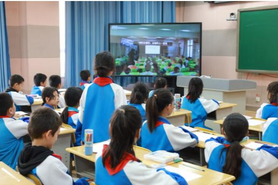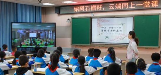 此时绍兴市培新小学、绍兴市越城区东湖中心小学和阿瓦提县鲁迅小学,三地的学生共同相遇在云端同上一堂课。这是孩子们通过上次书信交友后,第一次在屏幕上见到彼此。此时此刻,他们正共享老师的精彩课堂,学习着同样的课程内容,并实现了课堂上的实时互动交流。