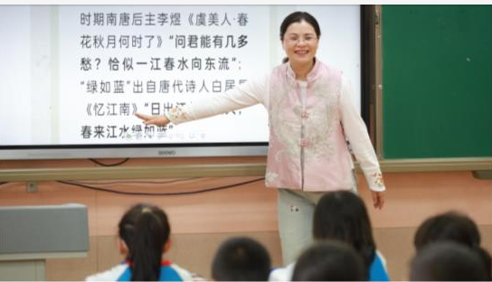 绍兴市培新小学张明明老师正在录播教室热情洋溢地上着课。