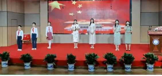 第一篇章《红色时代》 。 红色是青春的主色调,象征着热情、活力和梦想。青春就像一团燃烧的烈焰,追逐梦想,挥洒血汗,充满了无限的能量和激情,映射出青春的辉煌前程。 随着活动进入第一篇章《红色时代》,万潇雪、金晨晖、罗亚兰、何佩轩四位青年教师和杜周辰浩、雷珺雅、陈莘烁三位少先队员以诗朗诵《青春的对白》为引,用青春的语言,讲述红色故事,传承红色基因,激励师生们不忘初心,砥砺前行。